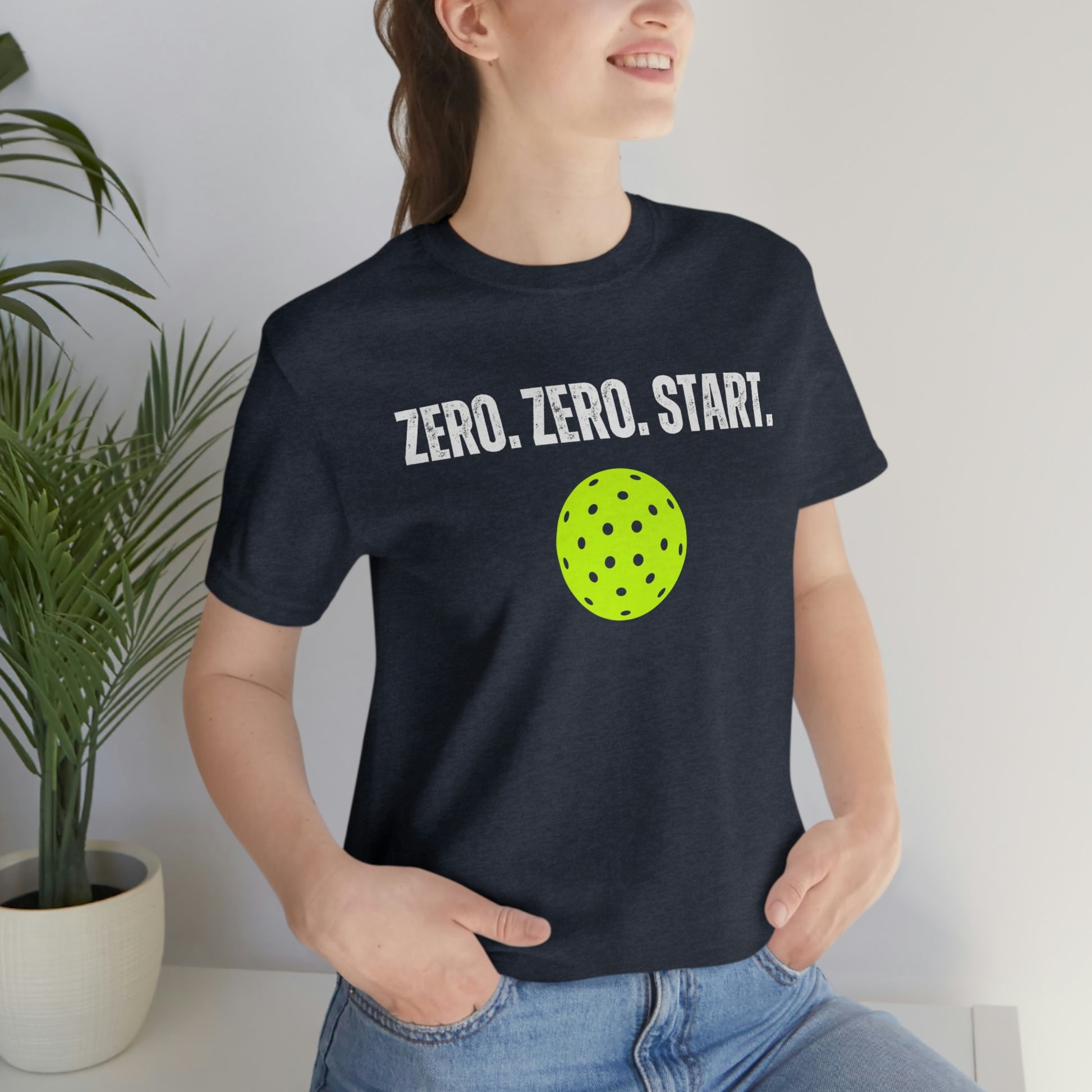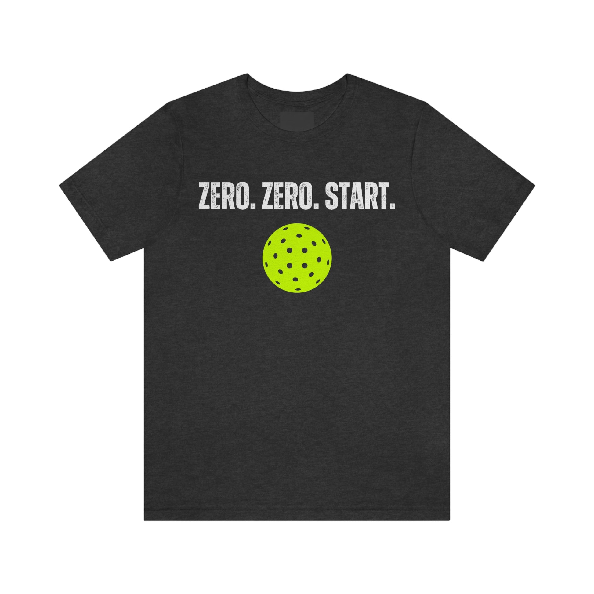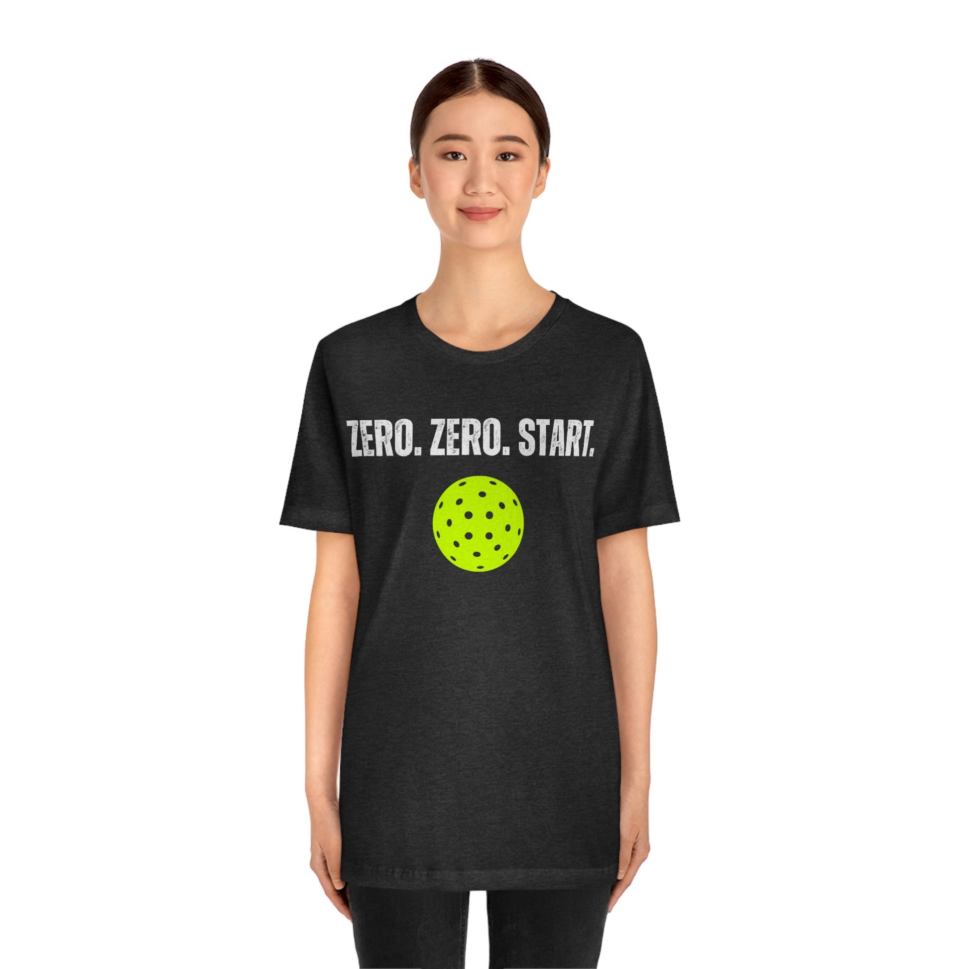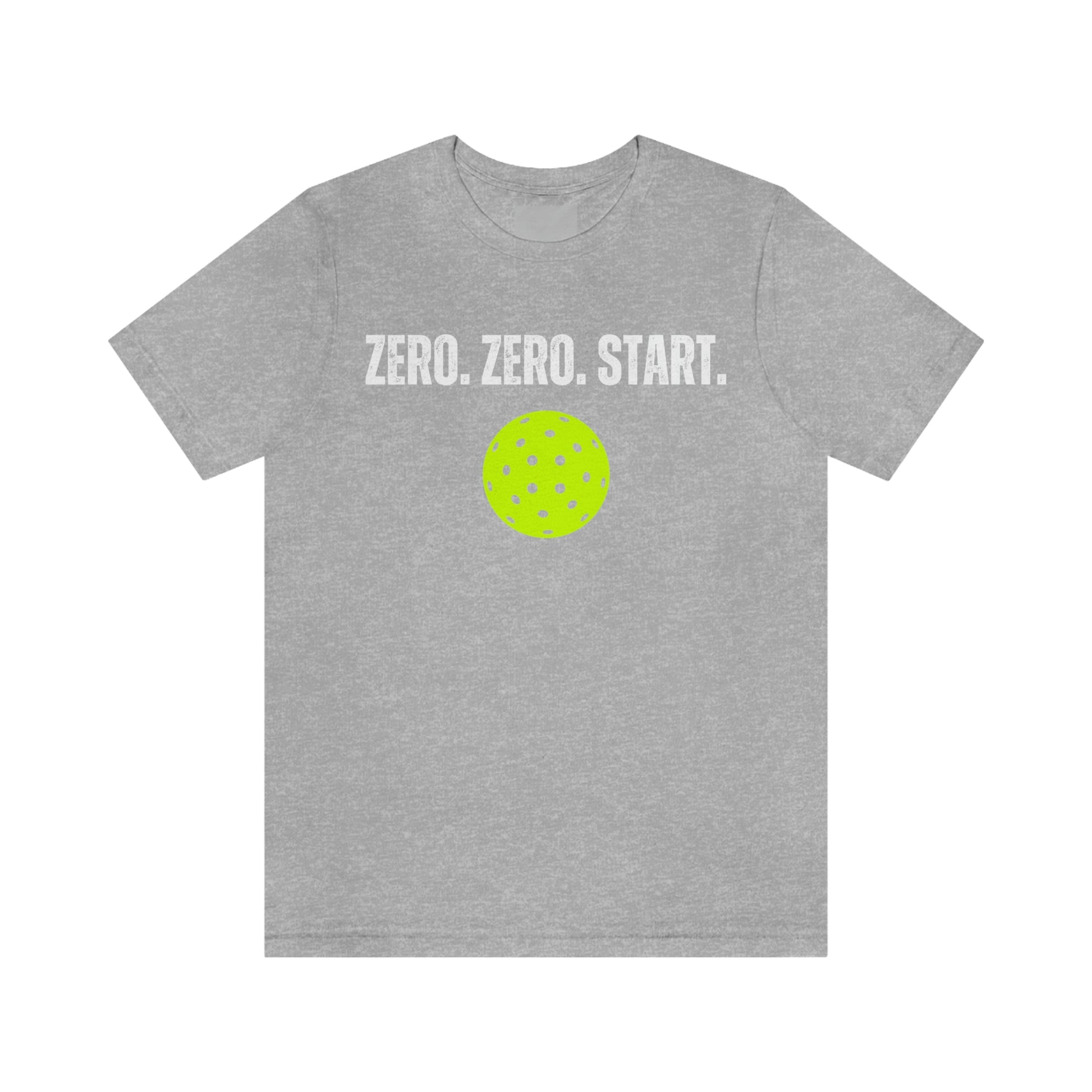 Zero. Zero. Start. Let the game begin. This classic unisex jersey short sleeve tee fits like a well-loved favorite. Soft cotton and quality print make users fall in love with it over and over again. These t-shirts have-ribbed knit collars to bolster shaping. The shoulders have taping for better fit over time. Dual side seams hold the garment's shape for longer.